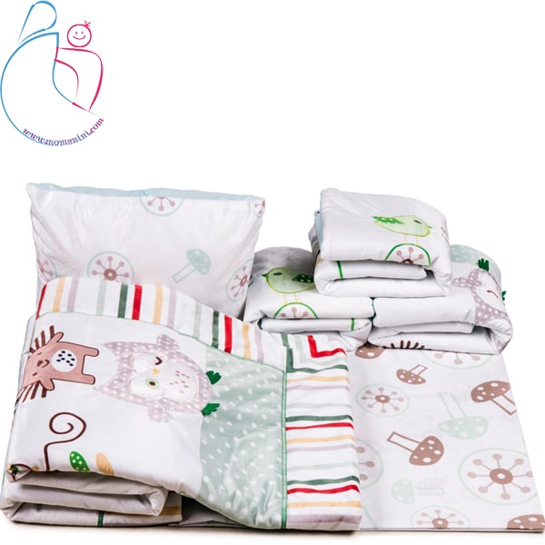 سرویس خواب هفت تکه عمدتا برای قرار گرفتن و نـصب بر روی تــخت نوزاد و کودک طـراحی شـده و شامل : لحاف (140*100) سانتیمتر – بالش (45*35) سانتیمتر- روبالشی اضافه سانتیمتر(45*35) – ملحفه (145*120) سانتیمتر- دورتختی (80*45)سانتیمتر می باشد. برای شستشوی این محصول می توان از ماشین لباسشویی و با دمایی بین 25 تا 30درجه اقدام نمود. همچنین پوشش بالش قابلیت جدا شدن و شستشوی مجزا دارد. استفاده از مواد مرغوب ، تنوع طرحها ، ظرافت دوخت ، قدرت چاپ ، بکارگیری هنر در گلدوزی ، تکه دوزی ، ایجاد برآمدگی و جداسازی برخی قسمتها ، وجود بندهای متصل به دورتختی ها جهت بسته شدن بر روی تخت و … از جمله مزیتهای این محصول نسبت به کالاهای مشابه موجود در بازار می باشد. این محصول در قالب دو گونه پارچه VELBOA و پلی استر ویسکوز تولید و عرضه شده است.