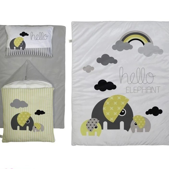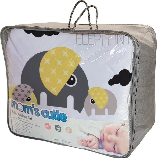 نقد و بررسی تخصصی ست خواب نوزاد برند مامز کیوتی مدل 4 تکه طرح فیل زرد و طوسی مامزنینی