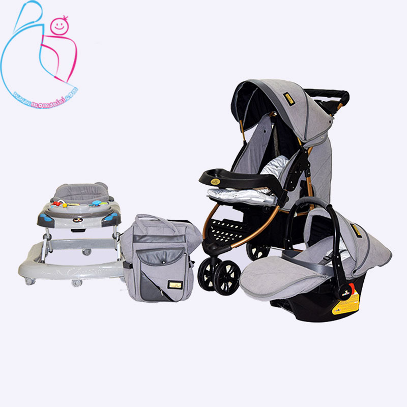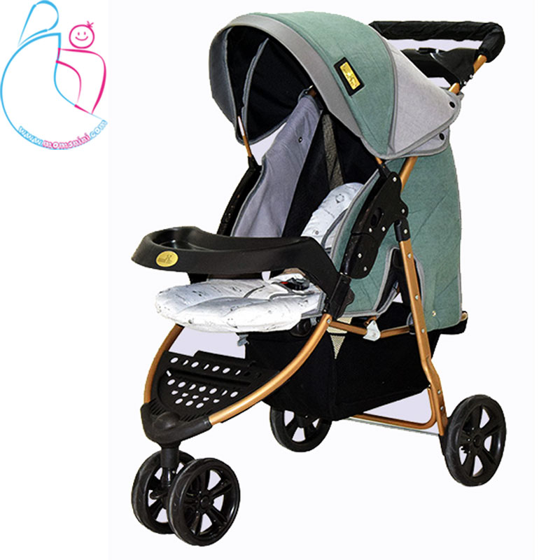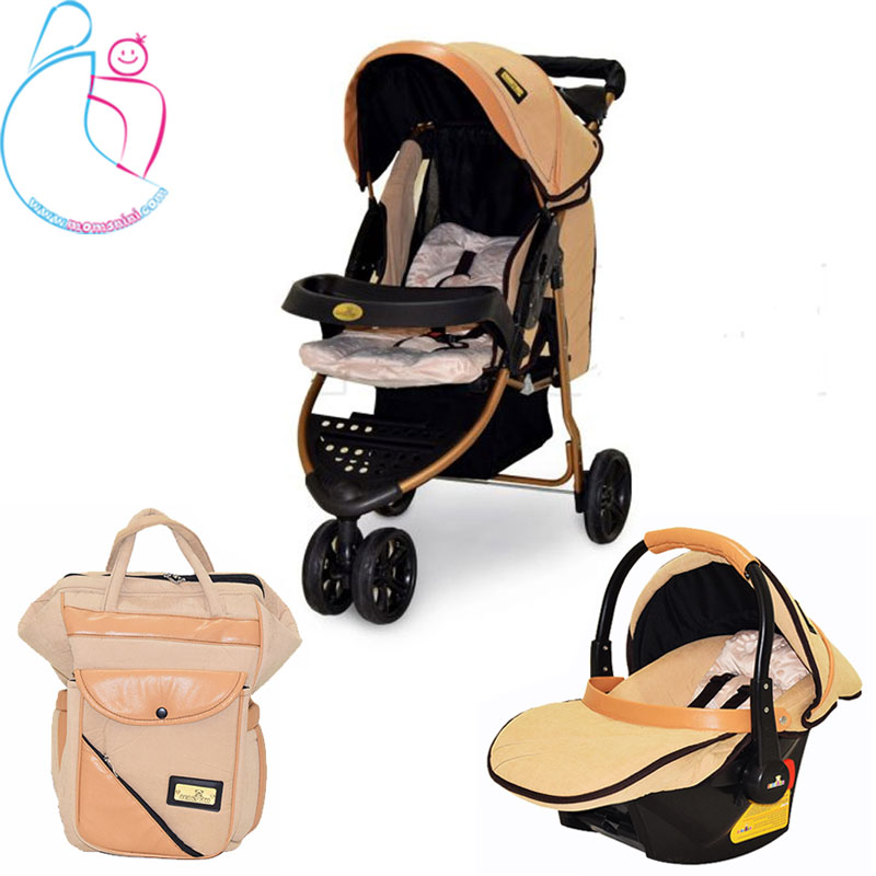 • کالسکه سه چرخ 319 بدنه طلایی کریر دسته آلومینیومی ساک لوازم کوله ای چرخ های جلویی کالسکه 319 دارای قابلیت 360 درجه است پارچه های این کالسکه از بهترین و لطیف ترین الیاف تهیه شده است که هوا را از خود عبور می دهند که این جا به جایی هوا به آرامش کودک کمک شایانی می کند .