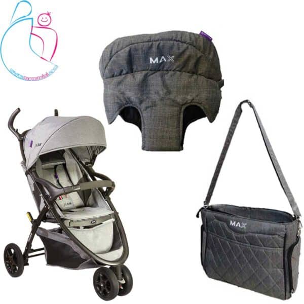 ست کالسکه دلیجان مدل مکس max سه چرخ دارای یک ساک لوازم کودک جادار است. این ساک لوازم نوزاد دارای فضای کافی برای تمام لوازم کودک است که بتوانید همه آنها را همراه خود داشته باشید.