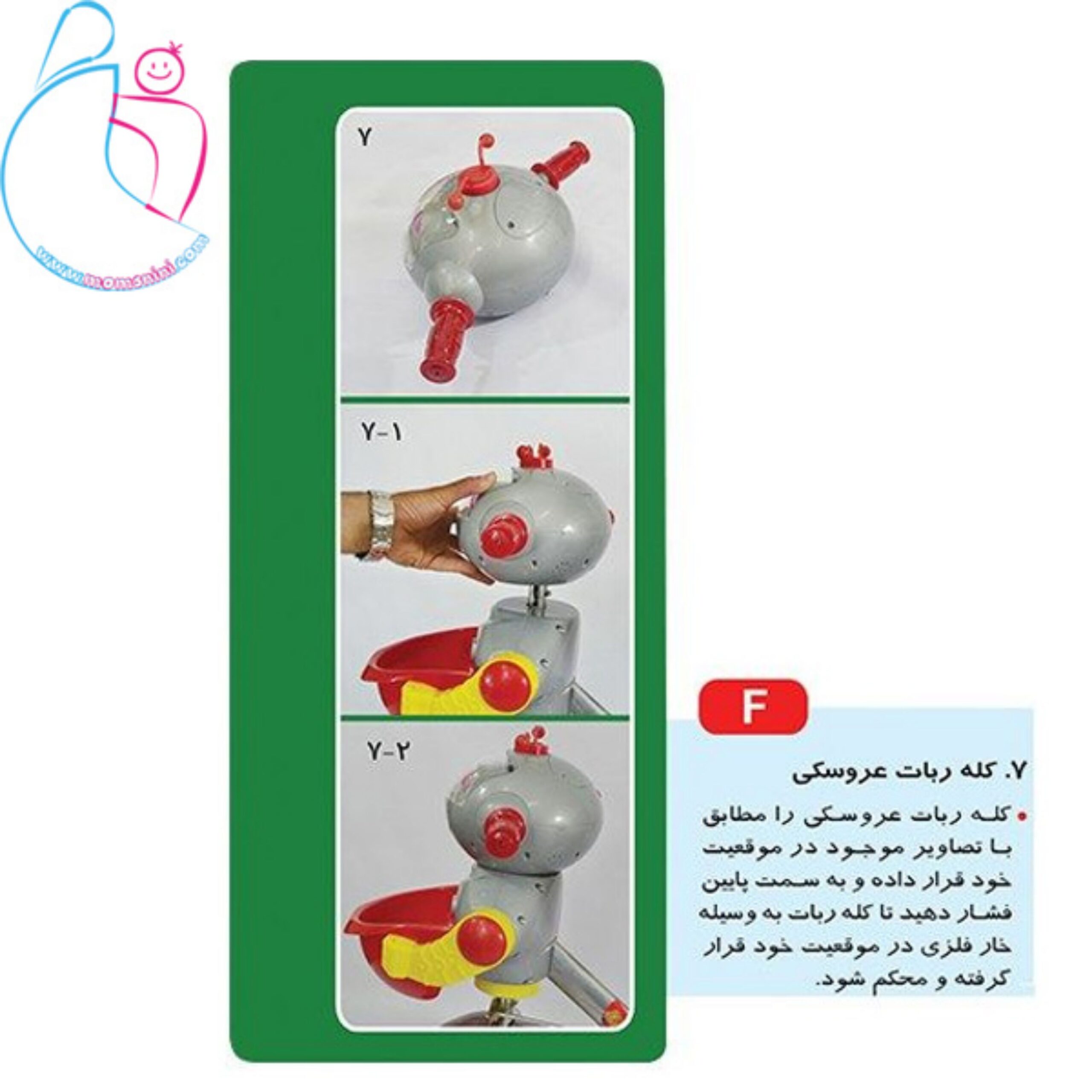 نصب فرمان و چرخ جلو ابتدا محور یا شفت چرخ جلو را نصب و با سه جفت پیچ و مهره (M5×50L) محکم کنید. سپس پدال را به چرخ و گلگیر را به دوشاخه متصل کنید. برای این کار پیچ‌های (ST4×25) را به کار ببرید. در ادامه چرخ‌جلو را با استفاده از پیچ و مهره‌های (M6×35L) به دوشاخه متصل کنید. حالا دوشاخه را به کمک یک پلاگ روی تنه‌ی اصلی نصب کنید. وقت نصب سر ربات و فرمان رسیده، درون محور دوشاخه فنر Vشکل را قرار داده و سر ربات را روی آن نصب کنید.