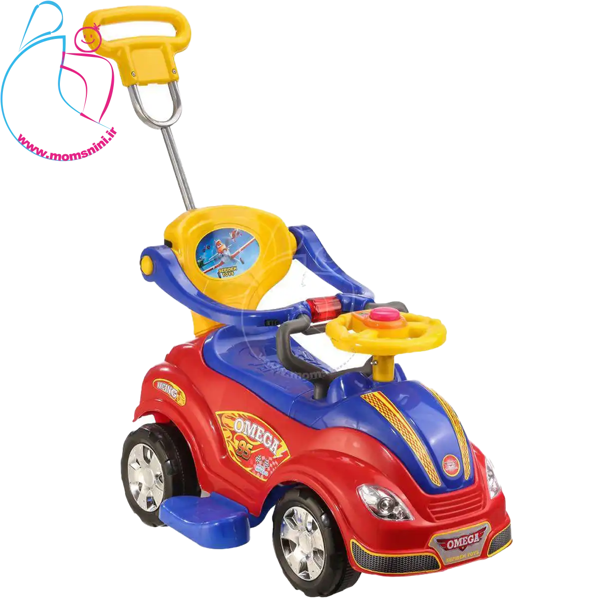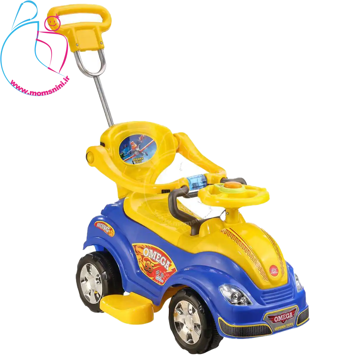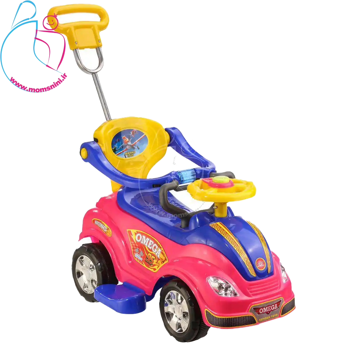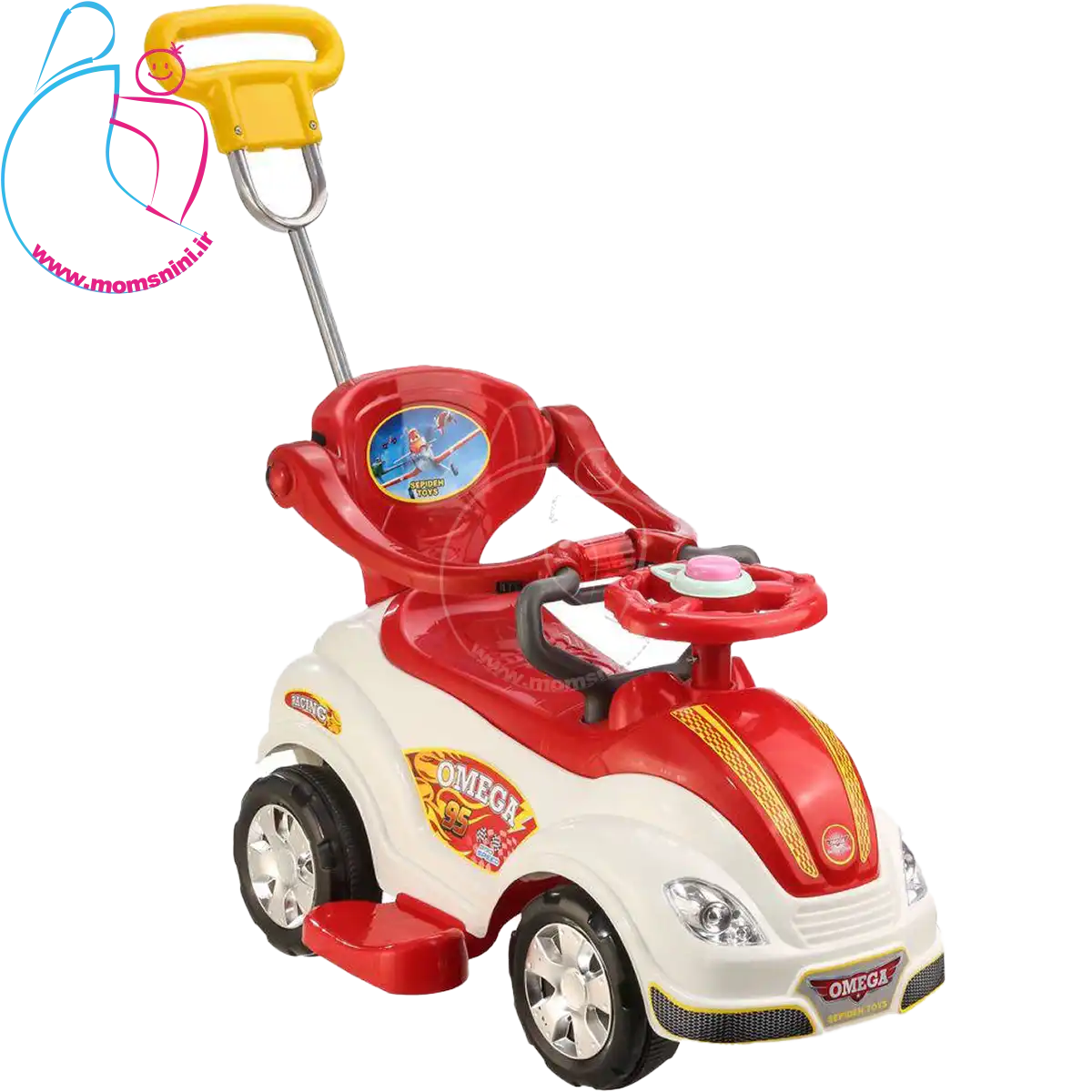 وسط فرمان اُمگا کار دکمه طراحی شده است که با فشردن آن صدای موزیک از ماشین پخش می شود تا کودک لذت و هیجان بیشتری را از بازی خود تجربه کند.همچنین ماشین دارای جغجغه رقص نوری میباشد که با چرخاندن ان روشن میشود تا کودک لذت و هیجان بیشتری را از بازی خود تجربه کند.این محصول دارای رنگ های مختلف جذاب برای کودکان می باشد. این محصول توان تحمل 30 کیلوگرم وزن را دارد و برای گروه سنی ۱ سال تا ۵ سال مناسب است.